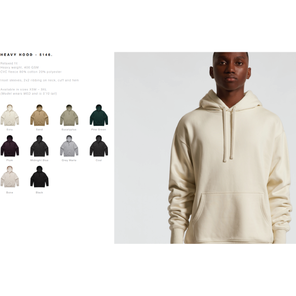 The AS Colour Heavy Hood, our warmest sweat. Tailored in a premium 400 GSM heavy weight cotton-rich blend, and oversized for a looser fit. Featuring inset sleeves, draw cords, a cozy pullover hood with self-fabric lining, and 2x2 ribbing on the cuffs and hem. Available in a range of colours.