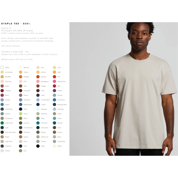 The AS Colour Staple Tee. Enduring comfort in a regular fit, crafted from 180 GSM 100% combed cotton. Featuring neck ribbing, side seams, and double needle hems for durability and minimal shrinkage, it's a timeless choice for comfort and style. Available in 70+ colours. Built to last.
