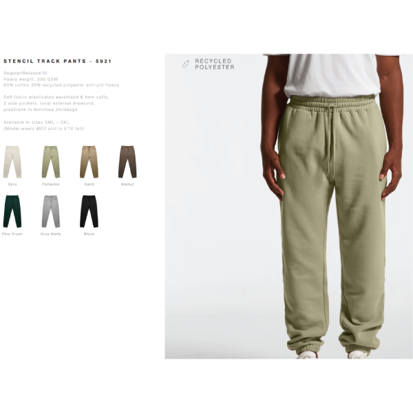 Discover comfort with the AS Colour Stencil Trackpants. These mid-heavy weight bottoms offer a regular fit, crafted from 80% cotton and 20% recycled polyester anti-pill fleece. Featuring self-fabric elasticated waistband and hem cuffs, along with a tonal drawcord and two side pockets, they are pre-shrunk for enduring wear.