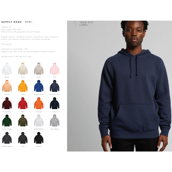 Elevate your casual wardrobe with the AS Colour Supply Hood. This essential hoodie offers a regular fit with a mid-weight feel, crafted from 80% cotton and 20% polyester anti-pill fleece. It includes a cozy hood, ribbed cuffs, and a tear-out label for added comfort and style.