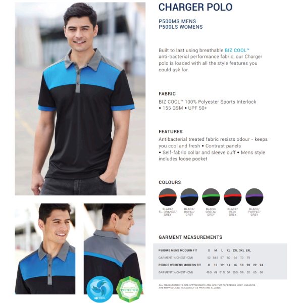 BIZ COOL™ 100% Polyester sports interlock, 155 GSM; UPF Rating 50+; Antibacterial treated fabric resists odour - keeps you cool and fresh