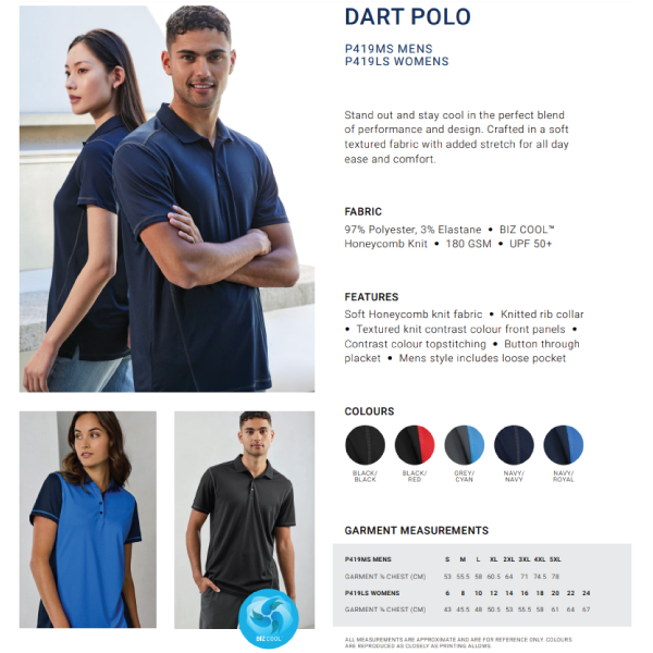 BIZ COOL™ 97% Polyester, 3% Elastane honeycomb knit; 180 GSM; UPF Rating 50+
