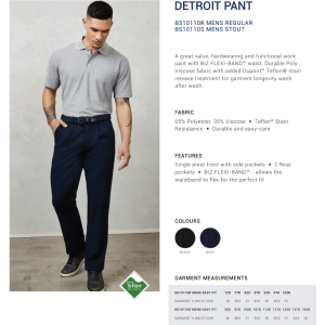 A great value, hardwearing and functional work pant with exclusive BIZ FLEXI-BAND™ waist. Our Biz Flexi-band feature allows the waistband to flex up to 1 inch to accommodate in-between sizes and allow maximum comfort for the wearer. Durable Poly Viscose fabric with added Dupont™ Teflon® stain release treatment ensures garment longevity wash after wash.
