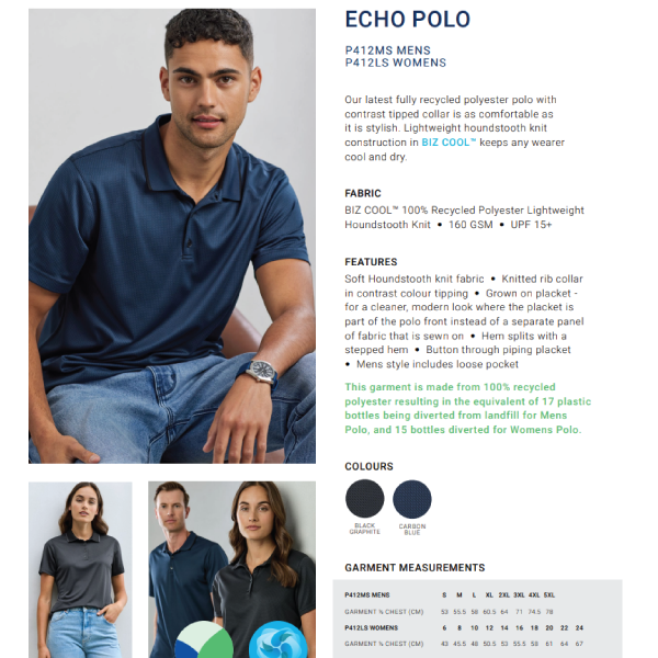 BIZ COOL™ BIZ ECO™ 100% Certified Recycled Polyester, 160 GSM; UPF Rating 15+