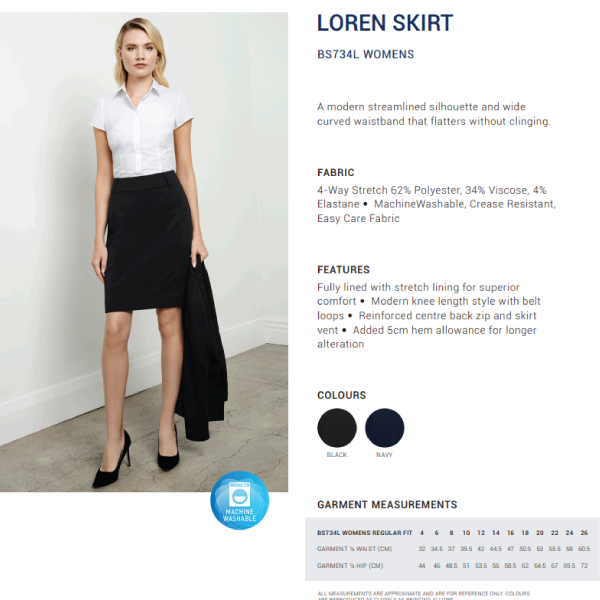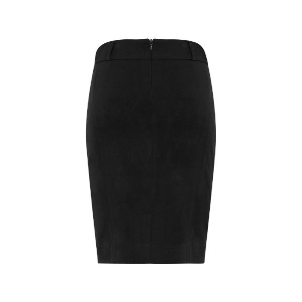 A classic corporate appropriate knee length skirt made better with 4-way stretch fabric and lining. The Loren skirt has a modern streamlined silhouette and wide curved waistband that flatters without clinging.