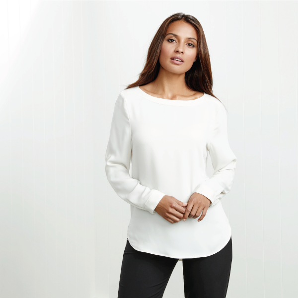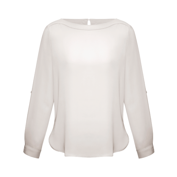 An elegant boatneck blouse adds a touch of minimalist chic to your fashionable uniform. A longer length with a stylish shirt-tail hem and functional roll-up sleeves are a practical feature for the working woman.