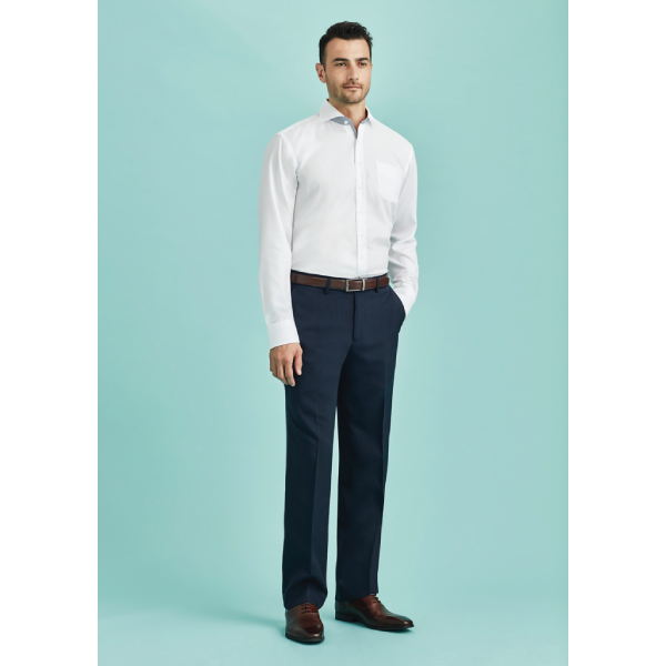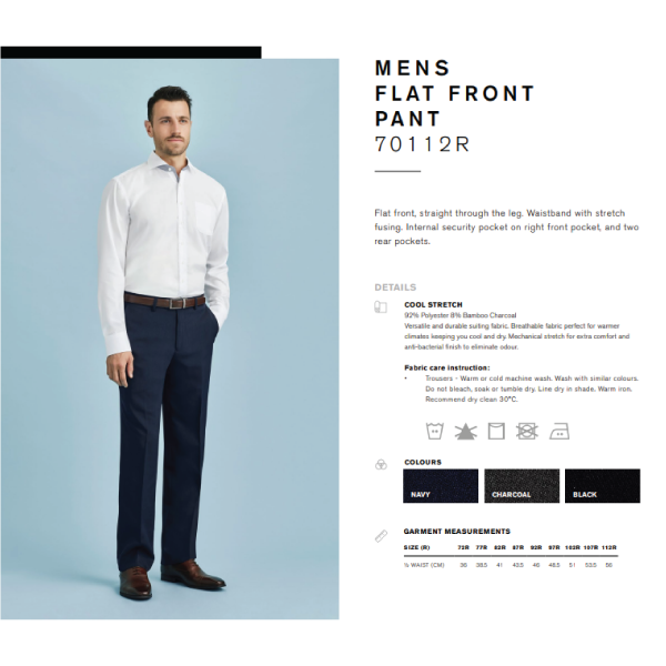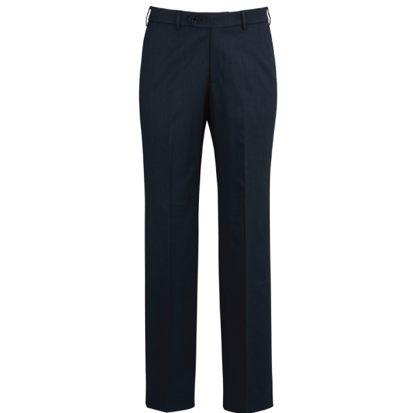 Flat front, straight through the leg. Waistband with stretch fusing. Internal security pocket on right front pocket, and two rear pockets.